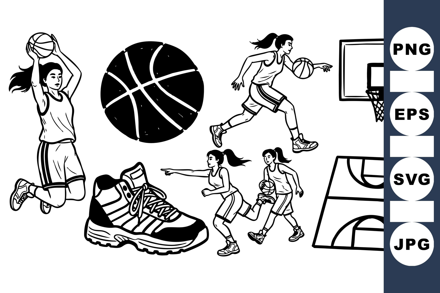 Black and white vector illustration shows a female basketball player performing dunk, dribble, and running actions with basketball gear and court elements, dynamic and sporty.