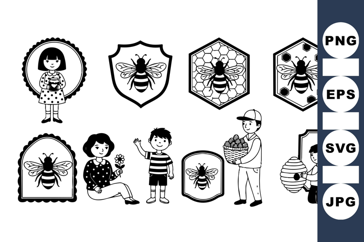 Black And White Art Farm Animal Illustration Nature Themed Vintage Bee Clipart Children Character Clipart Printable Craft Graphics Kids Honey Beekeeper Vector Honeycomb Design Pack Storybook Style Clipart