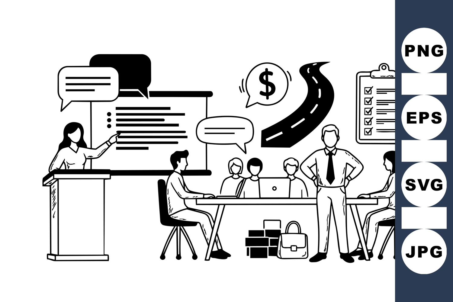 A clean black and white line art illustration of a business meeting showing a woman presenting, a man standing, and colleagues discussing finances and planning.