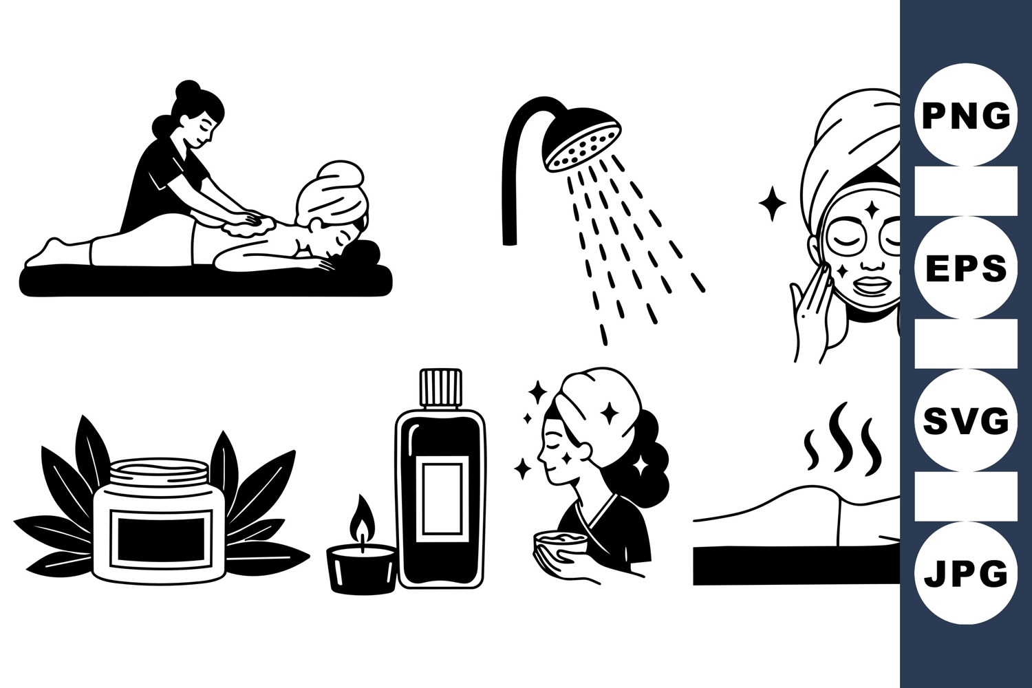 Black and white vector art shows spa scenes including massage therapy, facial skincare, shower, aromatherapy bottle with candle, and relaxation symbols for wellness themes.