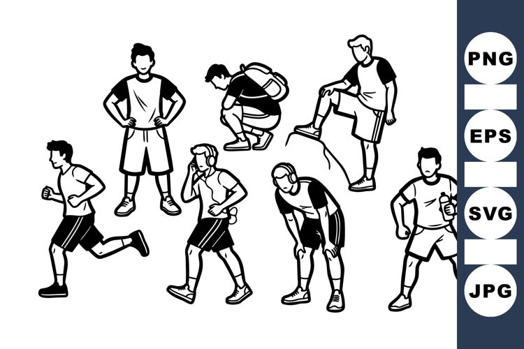 Minimalist black and white vector line art depicts young men in various fitness poses and actions, such as running, stretching, and standing with accessories, active and dynamic.