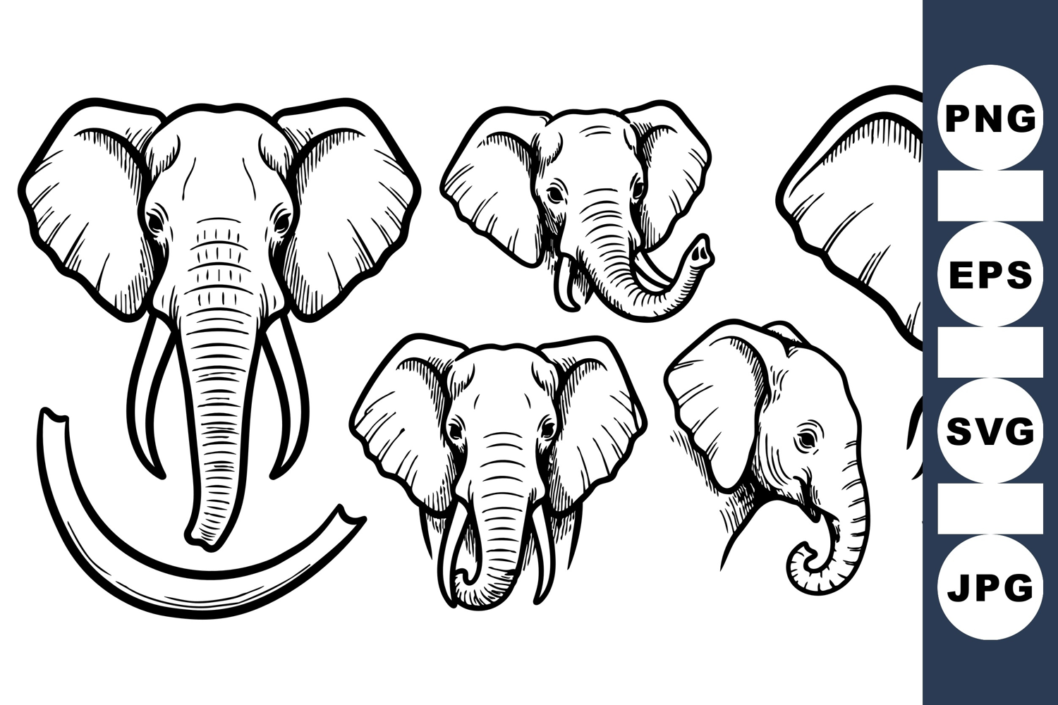 Detailed black and white line art features various elephant head angles including tusks, ears, and side profiles for educational or design uses.