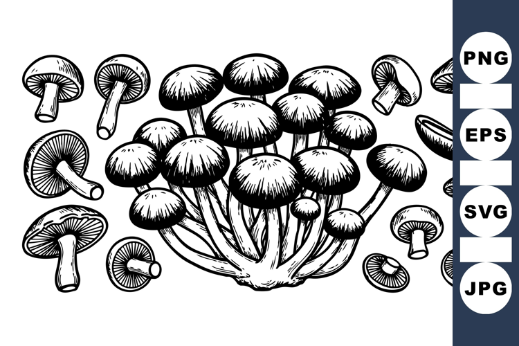 Detailed black and white line art of a mushroom cluster and individual mushroom caps, showcasing botanical elements with natural texture in vintage engraving style.