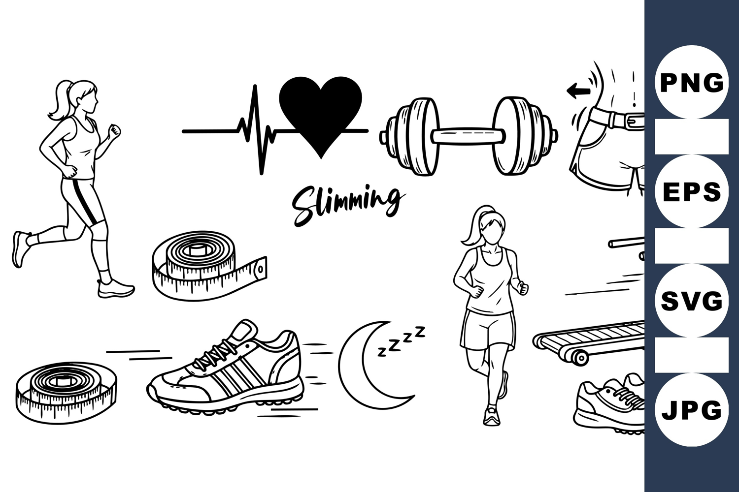 of black line art fitness and slimming icons showing running woman, measuring tape, dumbbell, treadmill, and health symbols for workout and wellness themes.