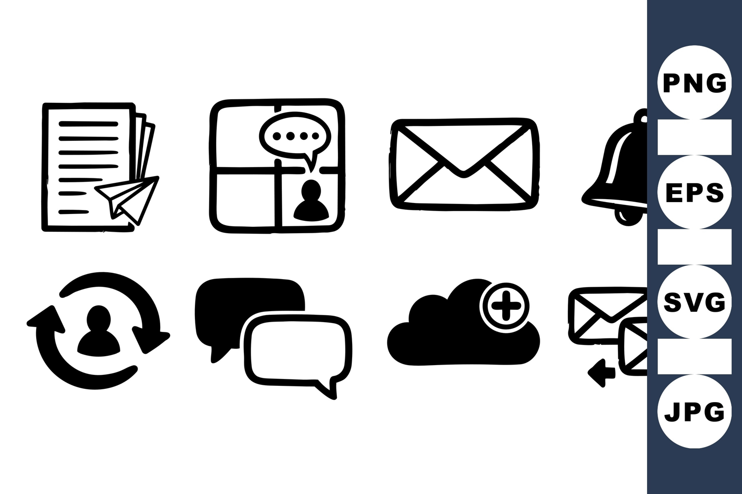Hand Drawn Icons Messaging Icon Paper Plane Vector Email Clipart Digital Communication Icons Chat Bubble Graphics Notification Bell Design Cloud Storage Clipart User Sync Symbols Message Exchange Pack