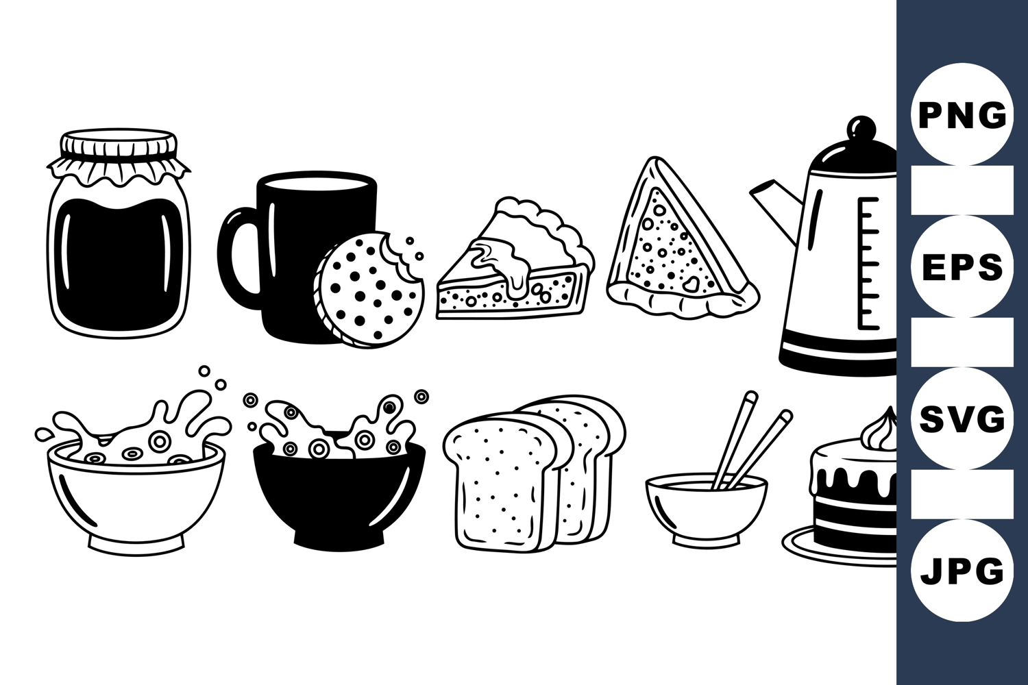 Hand drawn style black and white vector featuring various food and drink elements like jar, coffee cup with cookie, pie, teapot, splash bowls, bread, and cake slice with simple outlines, ideal for food icons or minimalist design projects in a clean, monochrome style.