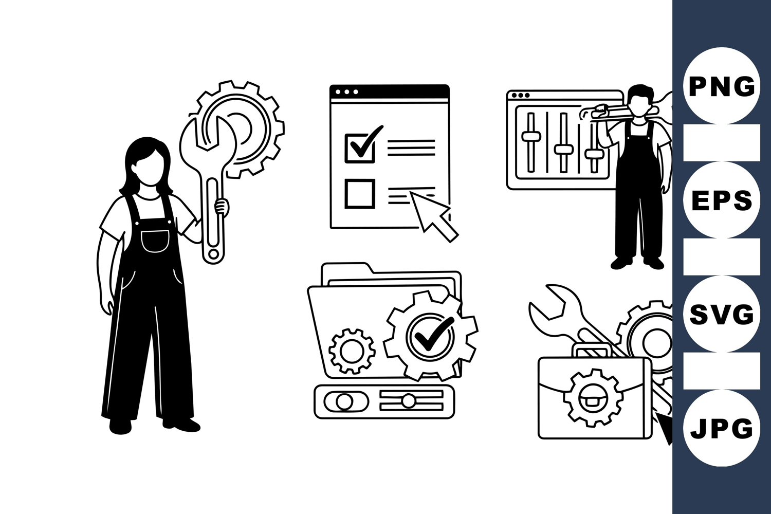 Black and white vector illustration depicts technicians with large wrenches, gears, checklists, and tings sliders in a simple technical concept design, minimalistic and clean.