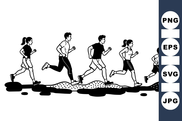 Five people, including men, women, and a child, are running on a dotted rugged path in a black and white vector style with clean outlines, energetic motion