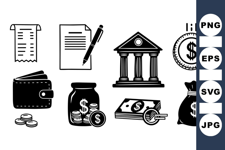 Collection of black silhouette financial icons including bank, money bag, stacks of bills, coin jar, wallet, and receipt, designed in minimalist vector style with clear outlines.