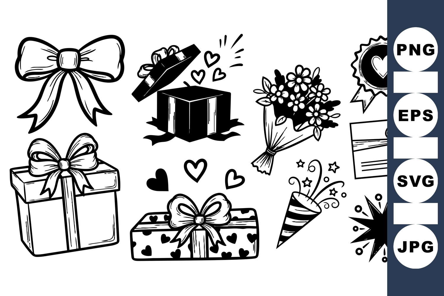 Hand drawn black and white valentine’s day themed icons featuring gift boxes with bows, heart motifs, bouquet of flowers, confetti popper, and love badge, festive and charming.