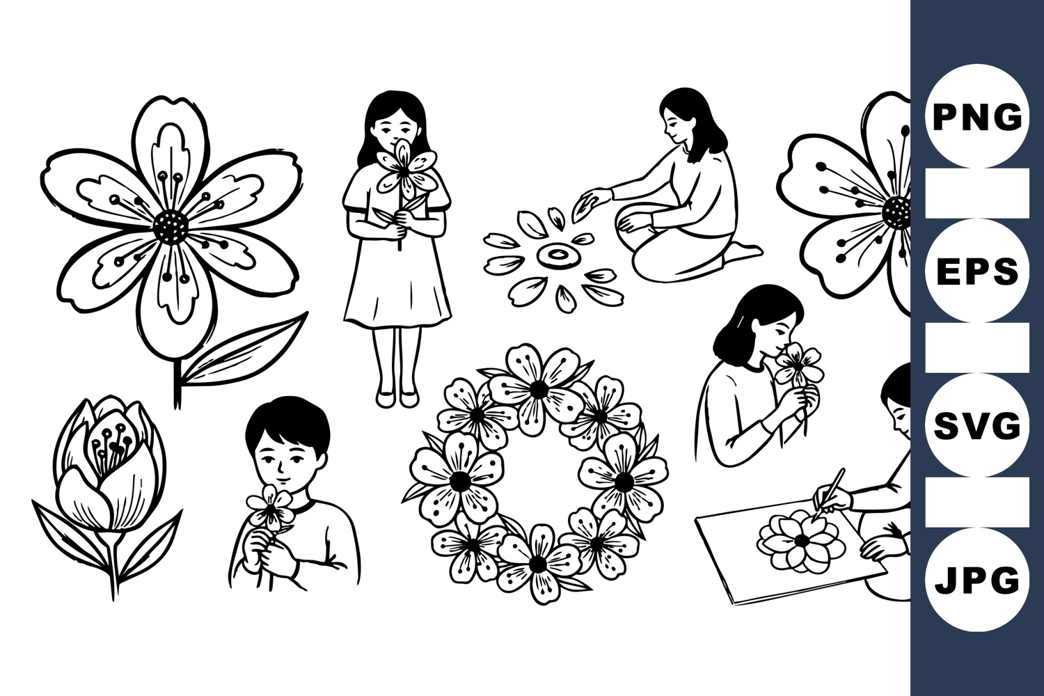 Spring Flower Floral Wreath Clipart Black And White Floral Hand Drawn Flower Flower Girl Clipart Botanical Sketch Cute Flower Drawing Flower Boy Illustration Child Holding Flower Outline Flower Art