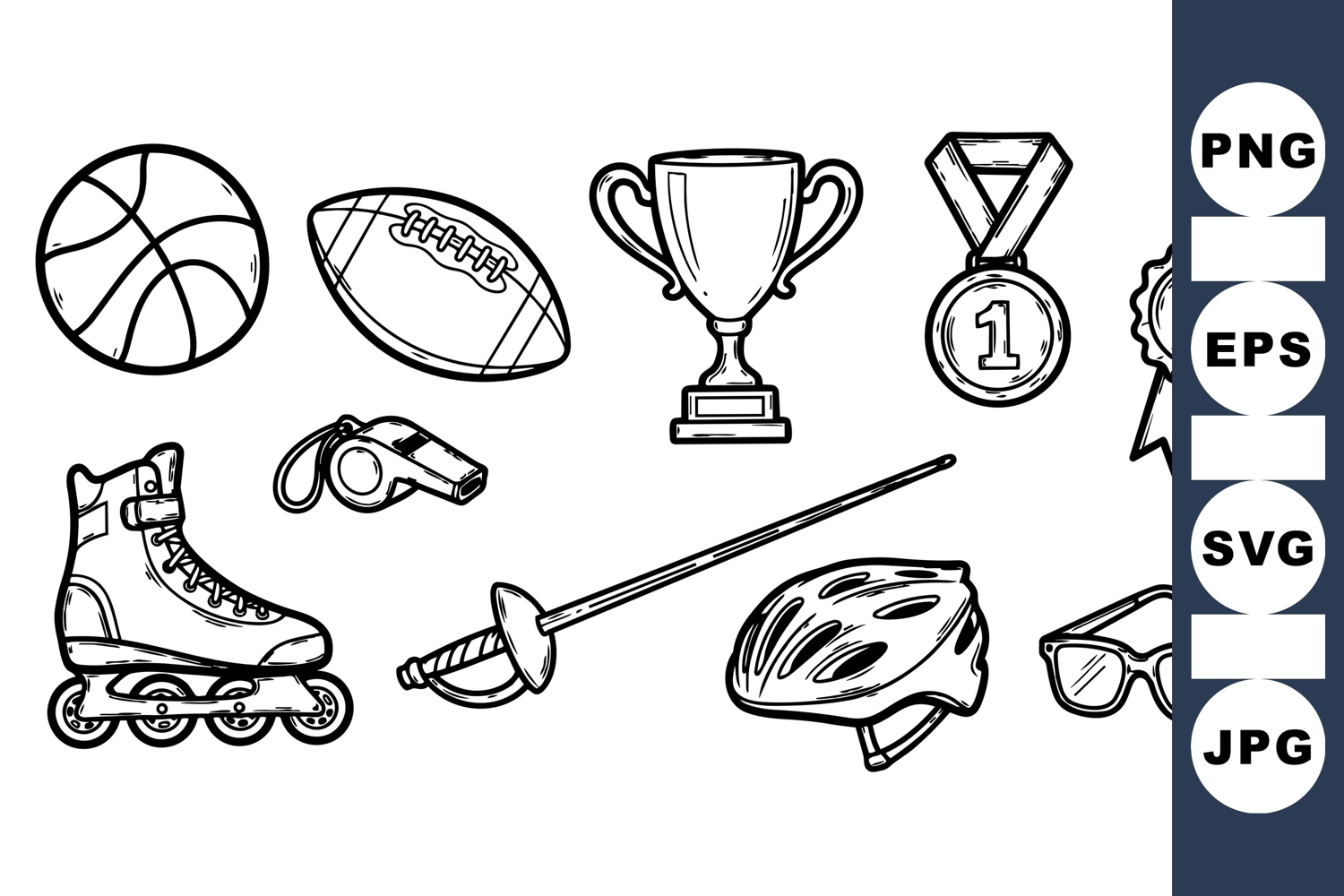 Hand drawn style black and white line art features various sports equipment and awards like a basketball, football, trophy, medal, roller skate, whistle, fencing sword, helmet, and sunglasses.