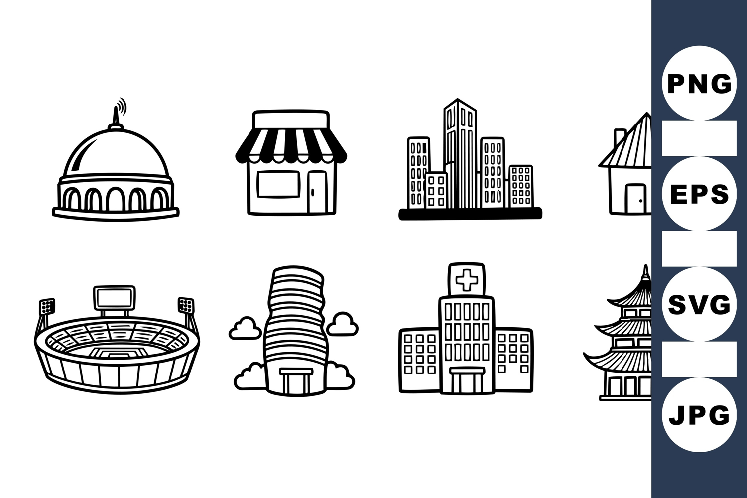 Hand Drawn Icons Hospital Building Clipart City Building Icons Black Line Drawings Urban Architecture Vectors Vector Building Pack Modern City Illustrations Traditional Pagoda Graphic Stadium Vector Storefront Icon