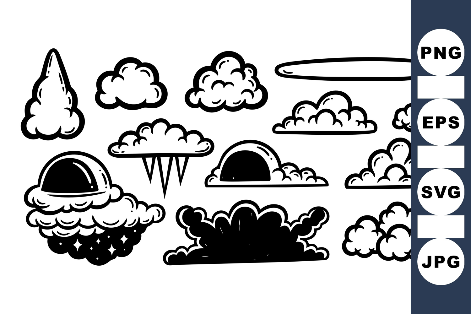 A collection of black and white cartoon style cloud vectors featuring diverse shapes and outlines, ideal for graphic design, comics, and weather illustrations, playful mood.