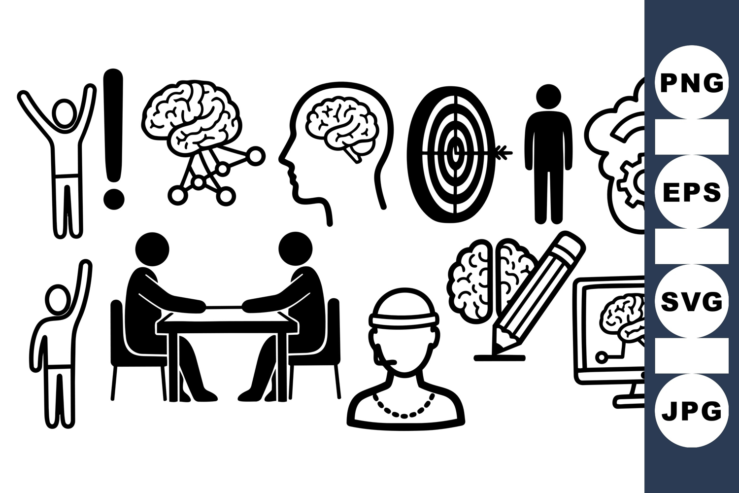 A collection of black and white conceptual vector icons including brain with connections, person silhouette, handshake, target with arrow, and gears symbolizing process and mindfulness.