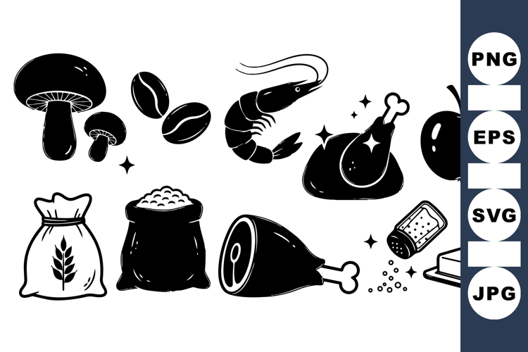 Simple black and white vector food icons showing mushrooms, shrimp, roasted chicken, apple, grain sack, ham, salt, and butter in minimalist silhouette style, clean and versatile.