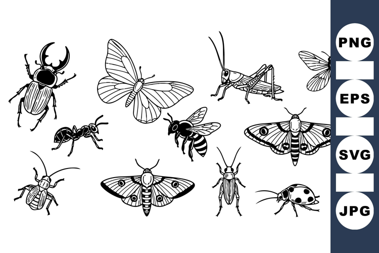 Detailed black and white vector insects including beetle, butterfly, bee, grasshopper, moth, and ladybug in scientific line art style for educational use, naturalistic.