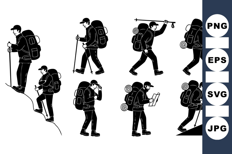 Black silhouette vector art shows hiker with backpack and trekking poles in various walking, climbing, and navigating poses for outdoor adventure design.