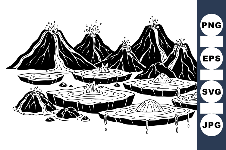 Black and white vector art shows multiple erupting volcanoes with flowing lava and magma pools in stark line art style, suitable for educational or geological designs, bold and clear depiction.