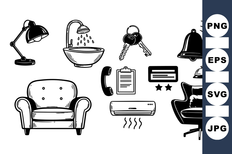 Hand Drawn Icons Black And White Clipart Office Furniture Door Key Clipart Vector Icon Collection Minimalist Office Graphics Desk Lamp Design Home Appliance Vector Living Room Icons Modern Home Illustrations