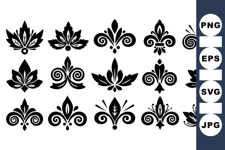 A collection of black fleur de lis symbols featuring abstract leaf elements in ornamental vector art, suitable for decorative design and vintage style projects.