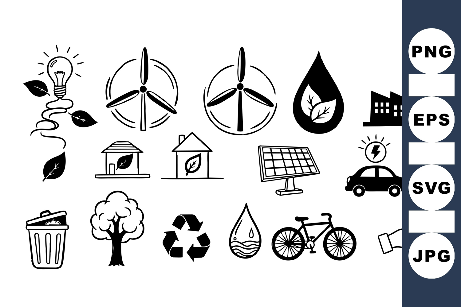 Renewable Energy Icons Environmental Protection Electric Car Vector Solar Panel Illustration Eco Friendly Graphics Recycling Symbol Graphics Nature Conservation Icons Green Energy Symbols Wind Turbine Icons Sustainable Living Vectors