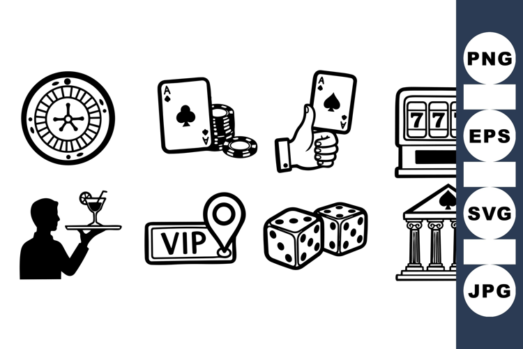 Minimalist vector icons depicting classic casino elements such as roulette, poker, slot machine, dice, vip sign, and cocktail service with clean line art style, balanced composition, versatile and sleek.