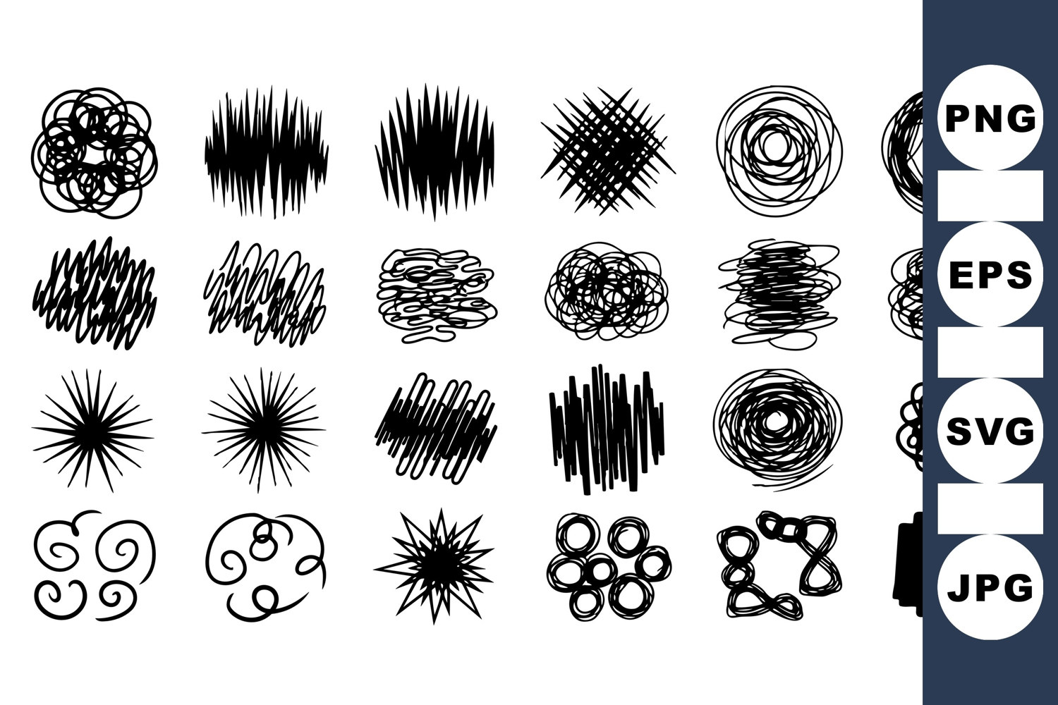 A collection of black hand drawn scribble shapes and chaotic line designs in vector format, ideal for creative backgrounds and artistic projects, dynamic and expressive.