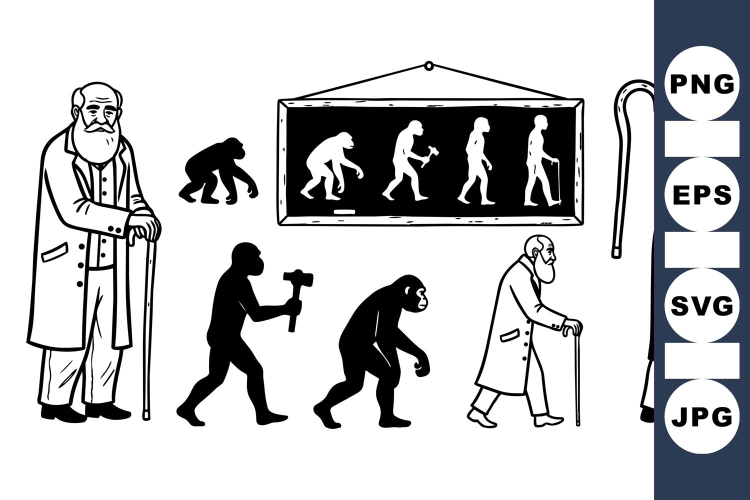 Monochrome vector illustration displays the evolutionary stages from primate to elderly man, including a framed progression sequence and walking aids, in a simple graphic style.
