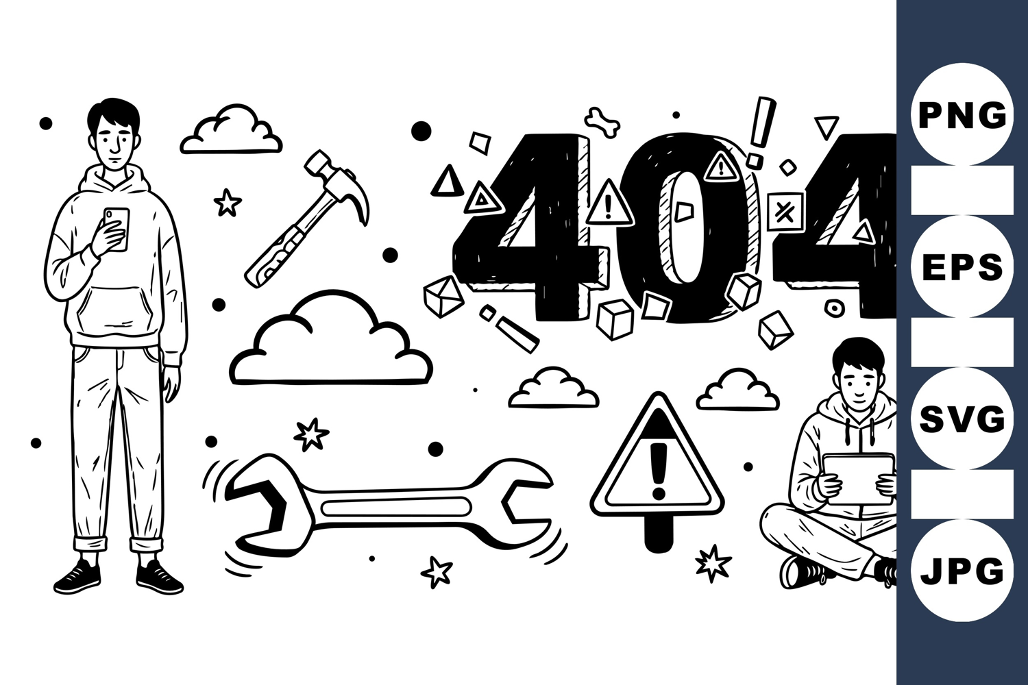 Minimalist black and white vector art showing a young man using smartphone and tablet with 404 error text, tools, warning symbols, and clouds in simple line style, useful for tech and website themes, calm mood