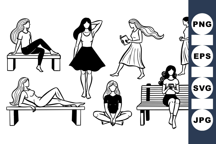 Stylized black and white vector line art features women in different casual poses including sitting, reading, walking, and using a phone in peaceful moods.