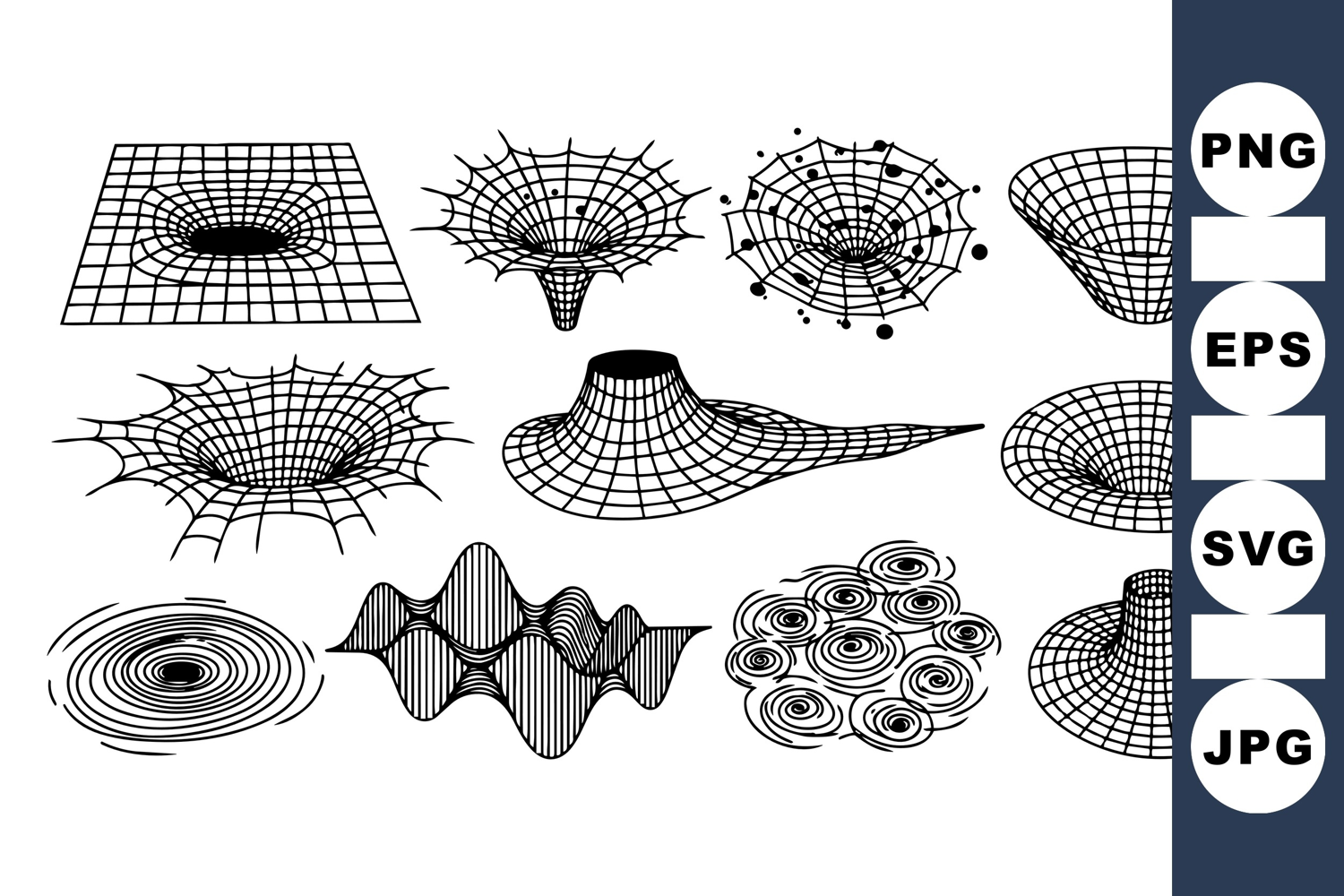 A vector collection of abstract wormhole and vortex shapes with grid mesh and spiral details, perfect for scientific or space themed illustrations.
