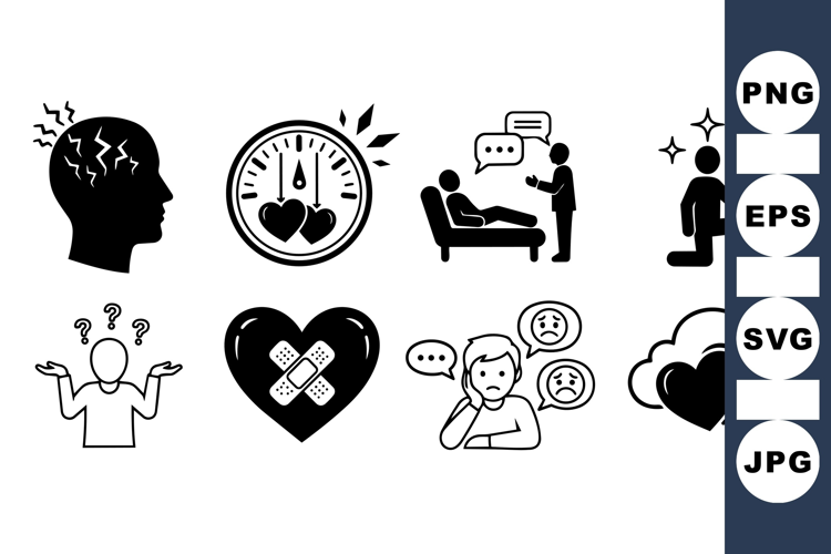 Black and white vector icons depict headache, heart therapy timer, psychotherapy session, emotional confusion, and mental health support in minimalist style.