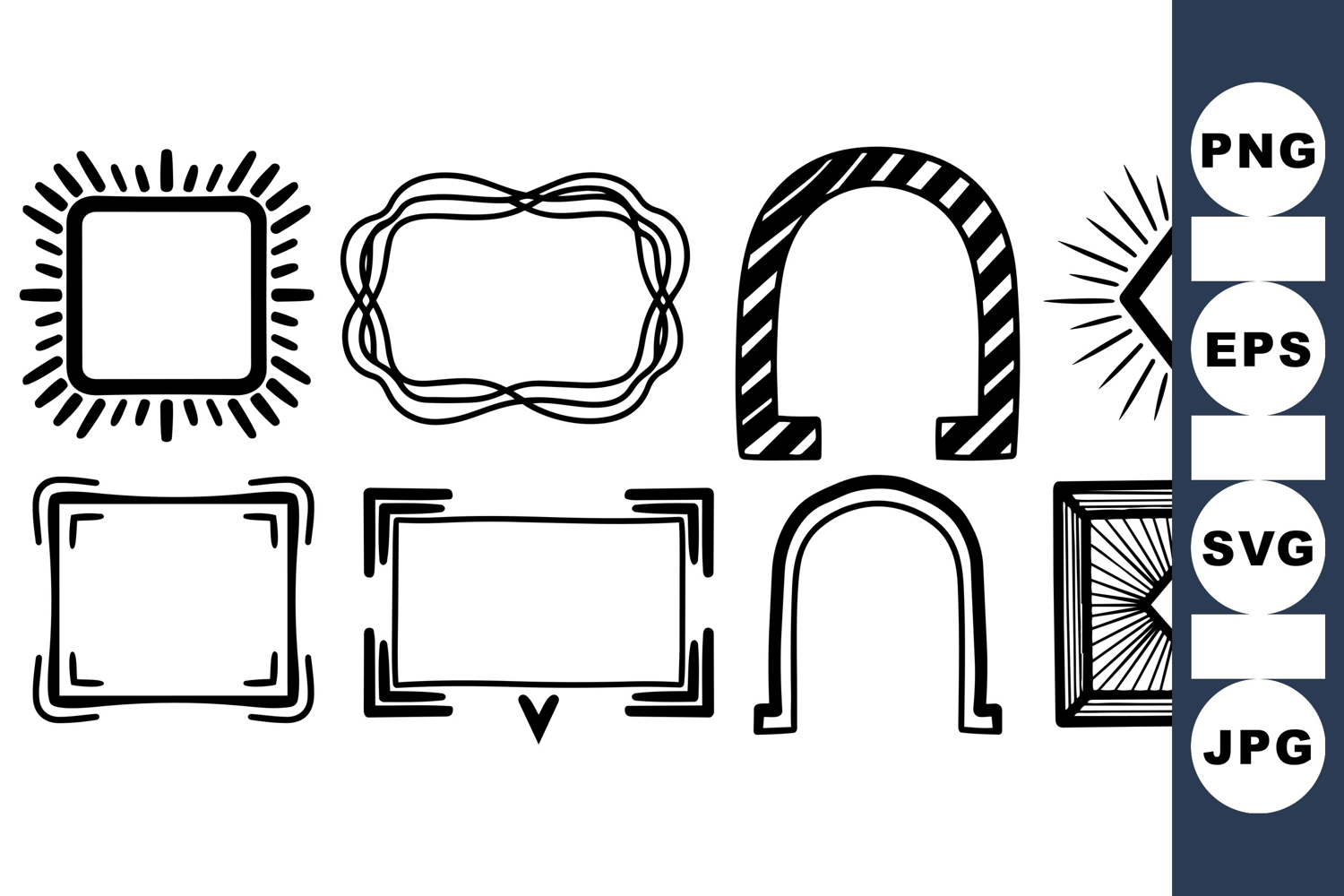 Collection of hand drawn black outline vector frames featuring square and arch shapes with decorative border elements, perfect for graphic design and print projects, artistic style.
