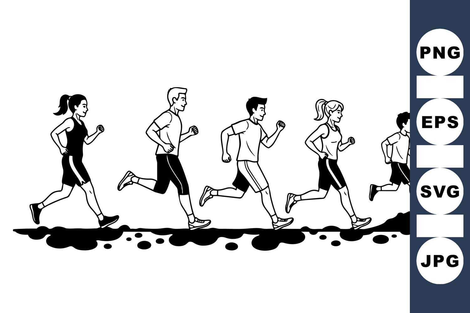 Dynamic black and white line art showing five people running in athletic wear along a trail, illustrating fitness, teamwork, and active lifestyle in a clean minimal style.
