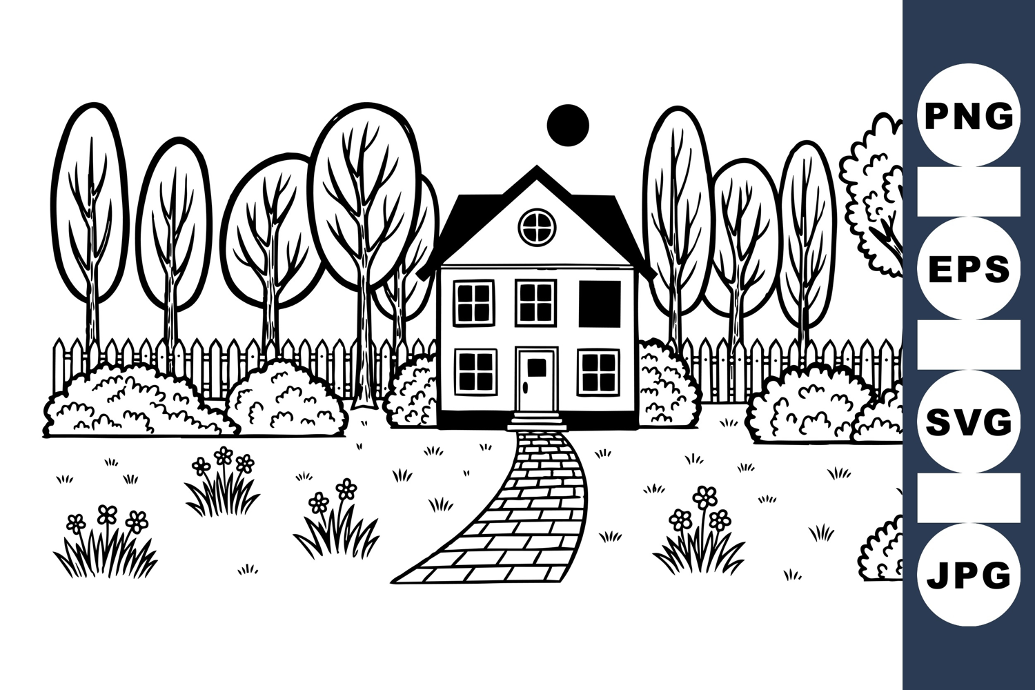 A detailed black and white line art vector shows a suburban house with a pathway, trees, bushes, and flowers in a calm outdoor ting, simple and peaceful.