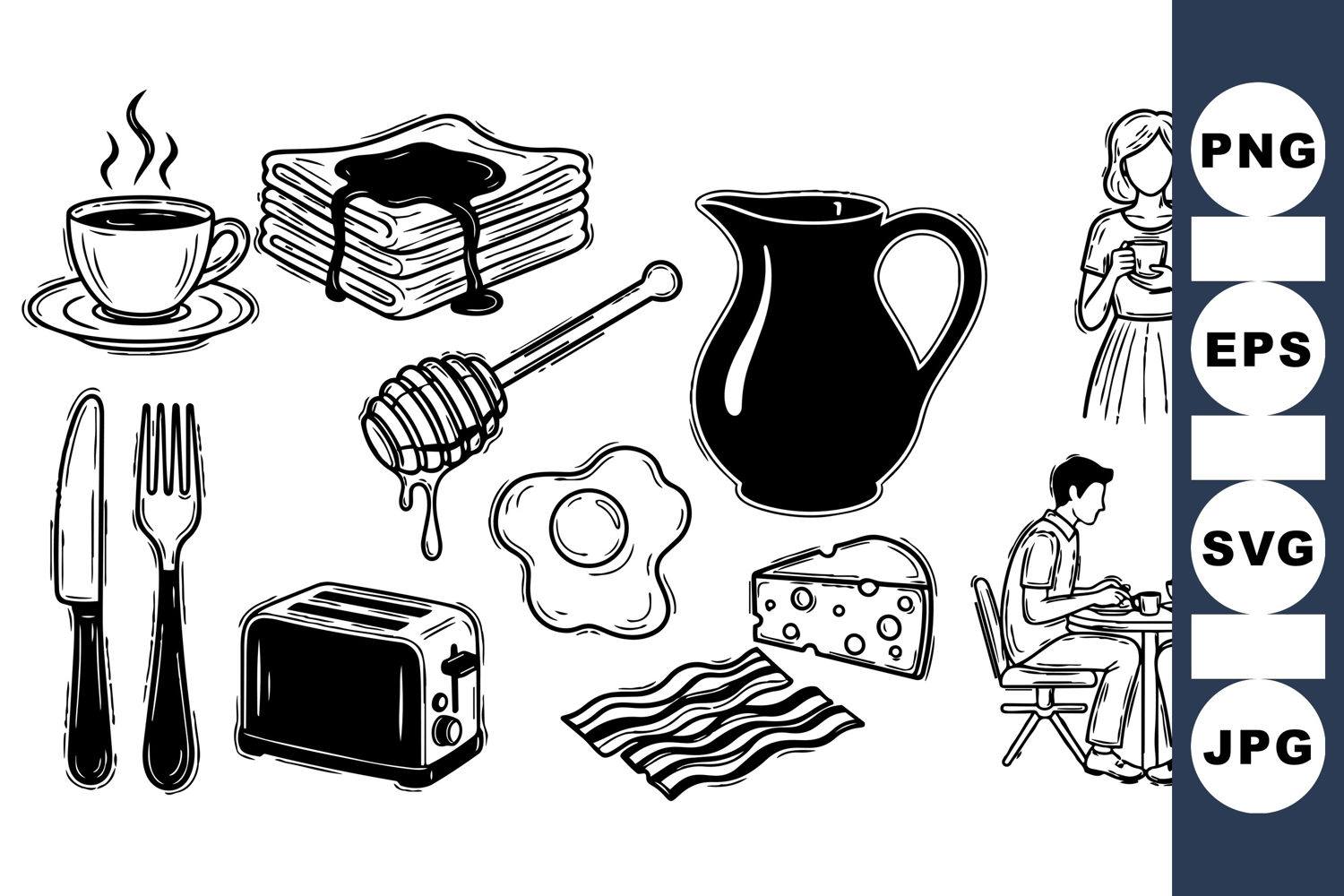 Kitchen Utensil Black Line Art Black And White Food Breakfast Food Pack Simple Vector Clipart Hand Drawn Breakfast Coffee And Pancakes Classic Breakfast Clipart Morning Meal Graphics Two People Dining