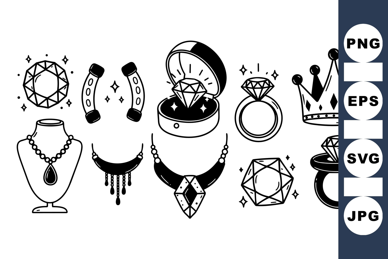 Minimalist black and white vector icons of sparkling diamonds, rings, necklaces, and a crown, suitable for jewelry branding and design projects with a clean aesthetic.