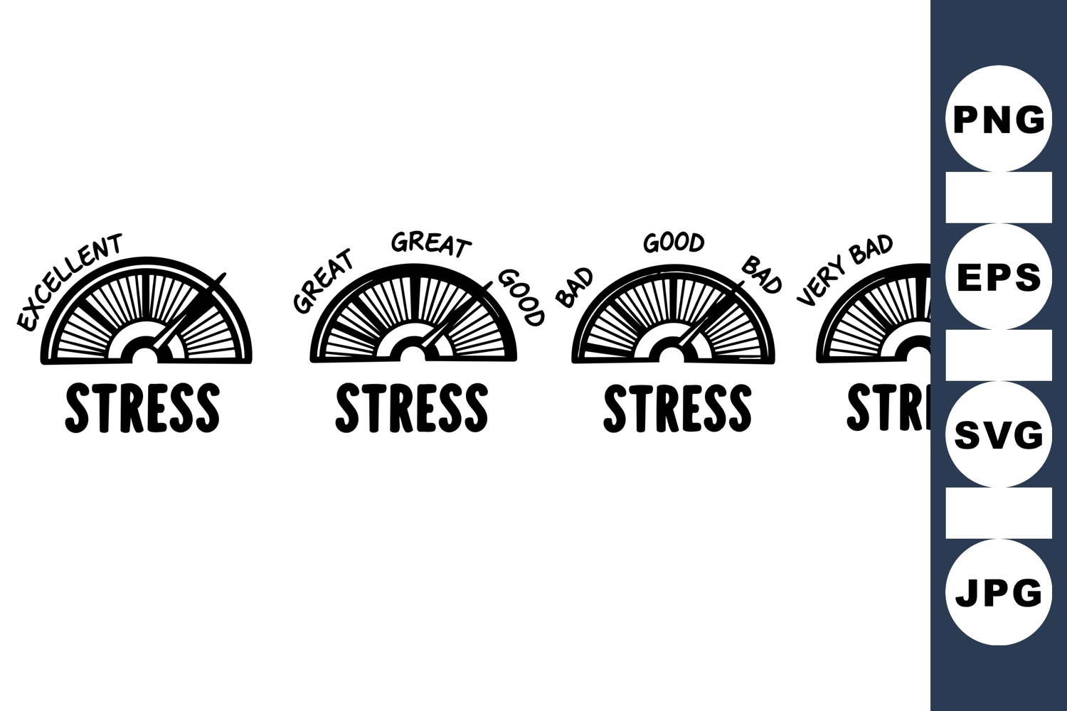 Black and white vector gauges depict different stress levels from excellent to very bad, with bold text and needle indicators in minimal style, clear and informative.