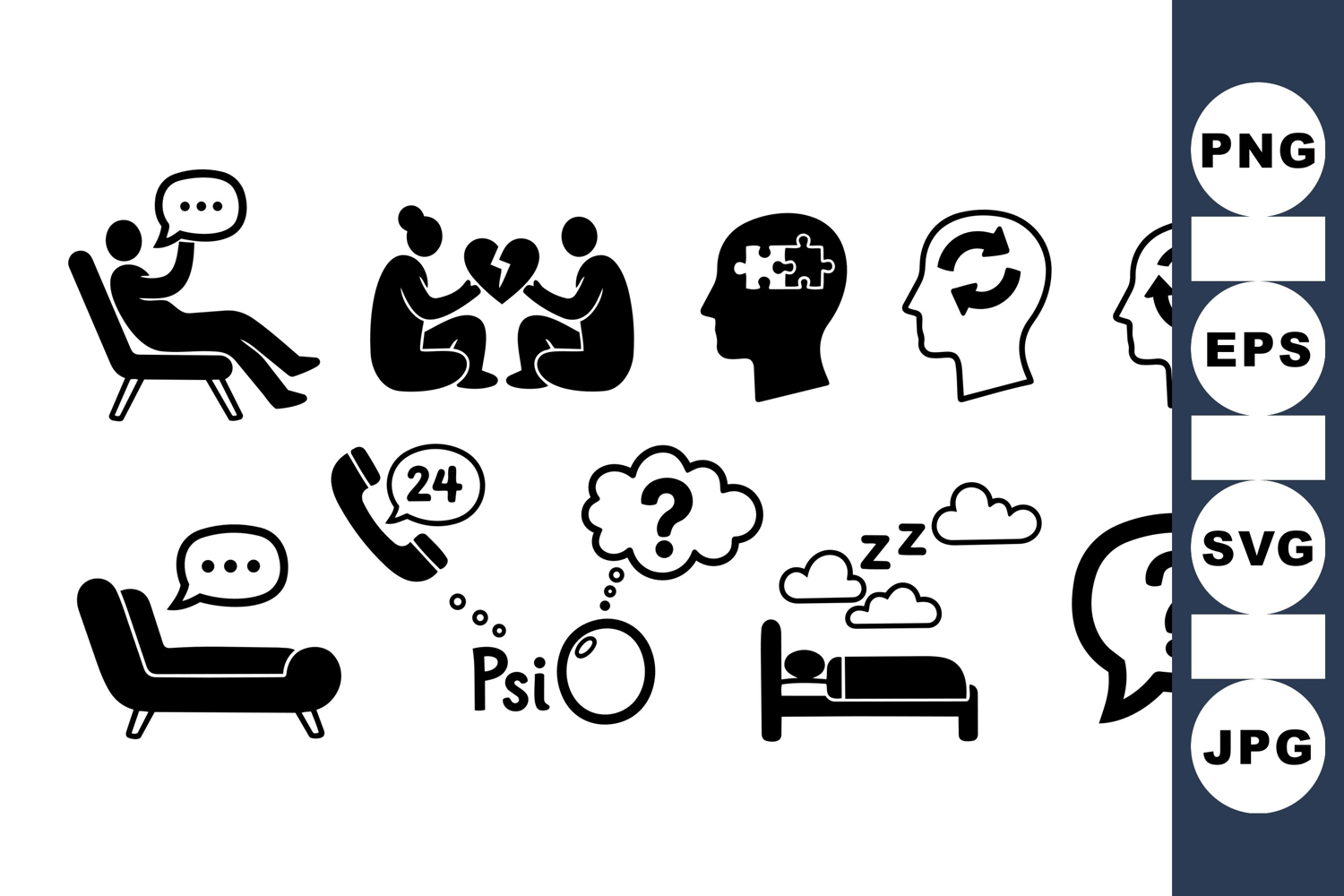 Mental Health vectors Mental Wellness Therapy Session Clipart Brain Puzzle Icons Psychology Therapy Icons Support And Help Icons Sleep And Rest Graphics Talking Couch Illustration Counseling Icon Collection Mental Care Svg Pack