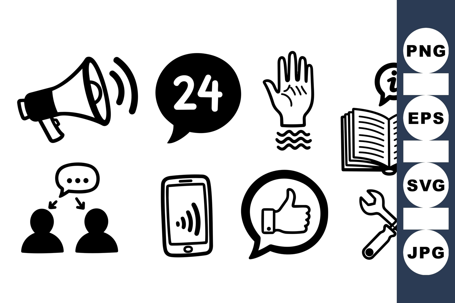 Collection of black and white flat icons representing communication, support, and services including megaphone, phone, chat, tools and information book in minimalist style.