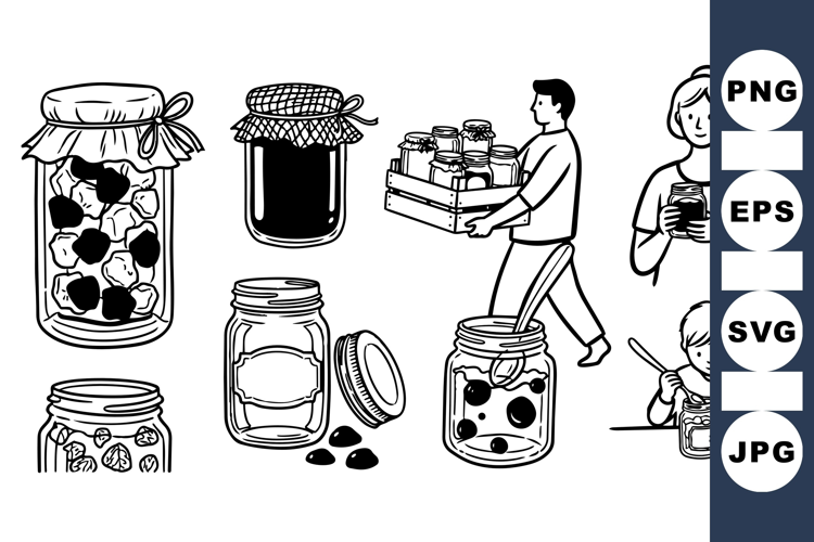 Line art vector features various jars filled with preserved foods, depicting family members handling jars and crates, illustrating home canning and food storage concepts.