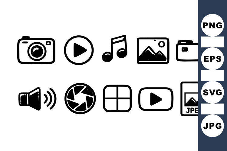 Hand Drawn Icons Video Camera Icon Music Note Symbol Sound Wave Clipart Digital Media Clipart Camera Lens Drawing Photo Gallery Design Play Button Graphic Image File Illustration