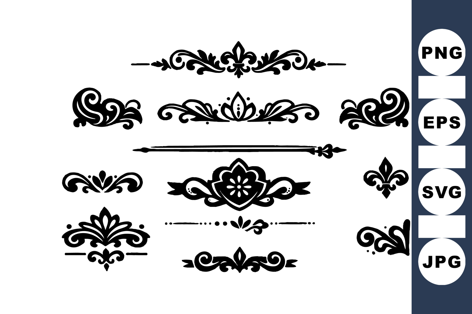 A collection of elegant black ornamental flourishes featuring vintage floral motifs and decorative swirls, suitable for enhancing classic invitations, headers, and graphic design projects with a refined look.