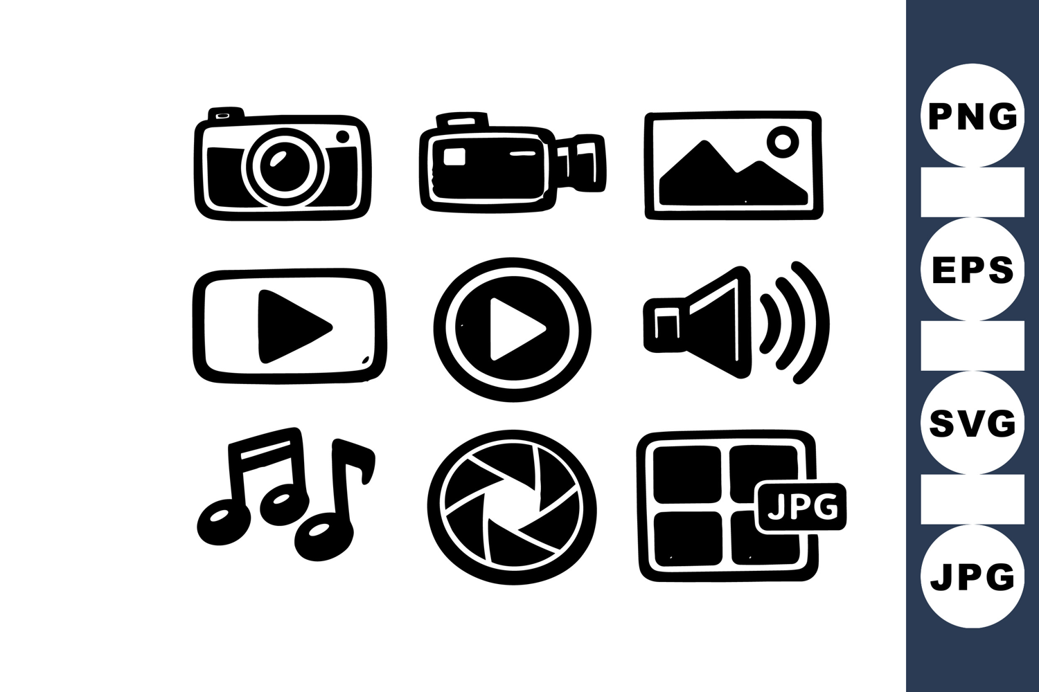 Hand Drawn Icons Music Note Icon Black Line Icons Digital Media Graphics Multimedia Icon Clipart Camera And Video Play Button Design Sound Symbol Graphic Photo Image Illustration Media Control Symbols