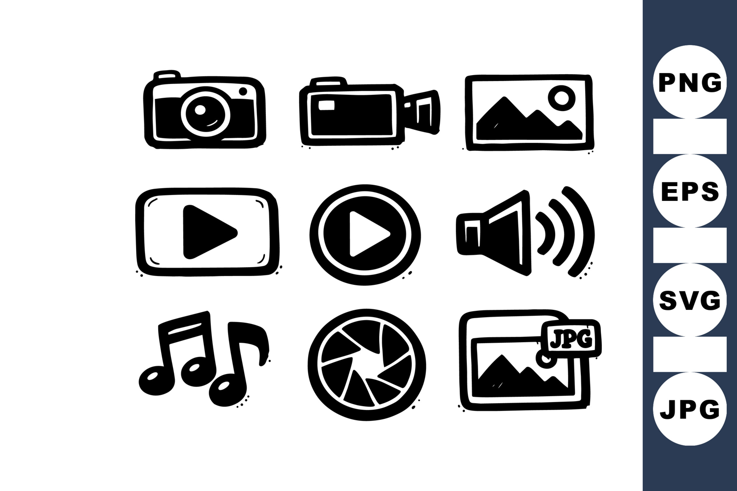 Illustration shows a collection of hand drawn black vector icons such as camera, video camera, play buttons, music notes, sound volume, shutter, and image file format in sketch style.