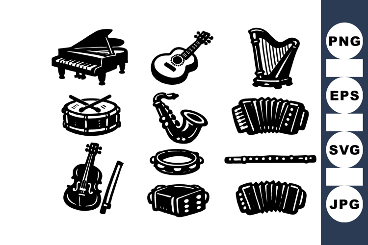 Bold black silhouette vector depicts twelve musical instruments in stamped graphic style, useful for icons, posters, sheet music art, and retro design projects, vibrant.