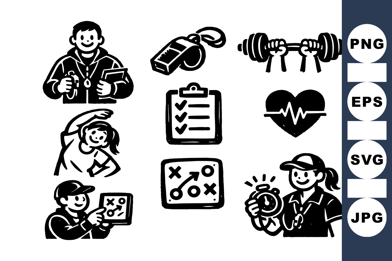 A black and white vector showing a sports coach with whistle, exercising person stretching, strategy board, checklist, heart rate, weights, and stopwatch in bold style for sports design.