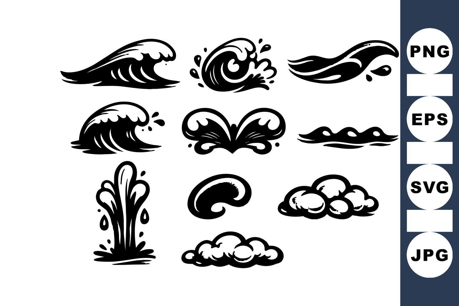 of black and white minimalist water splash vectors depicting waves, spray, and foam in various stylized shapes and forms, ideal for design projects and illustration work with crisp, clean line art.