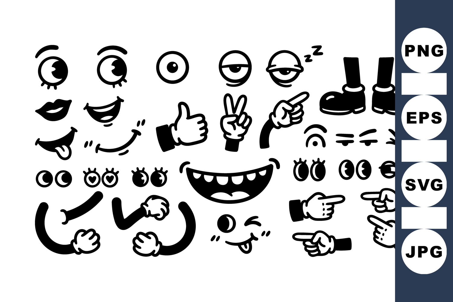 Black and white cartoon style vector features expressive eyes, mouths, hands, and legs with various emotions and hand gestures perfect for fun character design and animation projects.